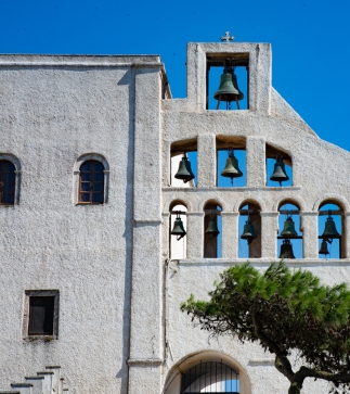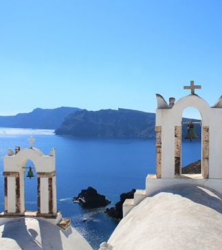 Τhis hidden gem unveils Oia's iconic scene with twin bell towers and three white domes.